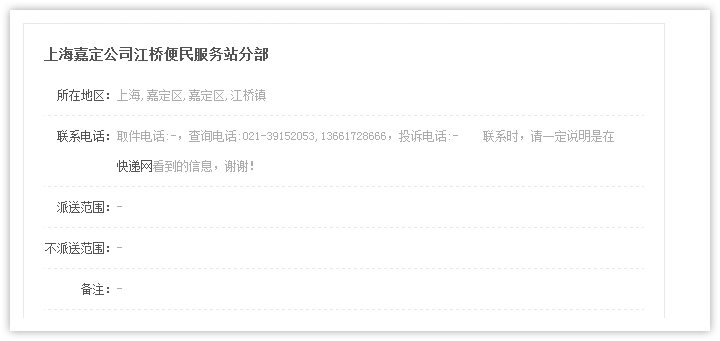 2、查詢結(jié)果頁面顯示符合條件的快遞公司網(wǎng)點(diǎn)列表,顯示快遞網(wǎng)點(diǎn)所在區(qū)域,公司地址和聯(lián)系電話,如需查看更多信息,點(diǎn)擊 【查看詳情】進(jìn)入網(wǎng)點(diǎn)詳細(xì)頁面查看。