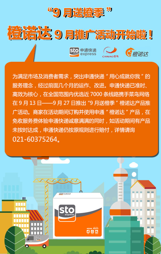 經(jīng)多日組織、籌備,九月十三日起申通快遞為迎合市場需求,進(jìn)一步拓展市場空間,搶占優(yōu)質(zhì)市場份額,發(fā)起了“九月送橙季”橙諾達(dá)產(chǎn)品推廣活動。